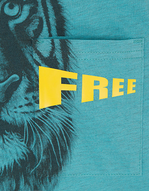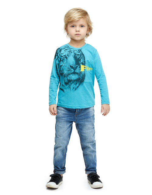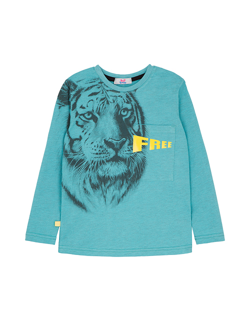 Комфортный и стильный лонгслив - настоящий хит сезона. Он понравится Вашему мальчику! Актуальный ультрамодный принт с изображением тигра добавит его образу мужественности. Накладной карман с яркой контрастной надписью придает изделию оригинальность