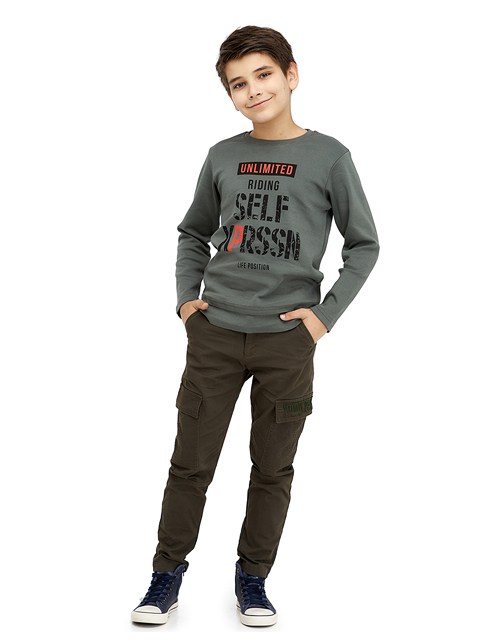 Лонгслив в трендовом цвете зелёная агава - изделие из разряда must have. Комфортный материал, свободный силуэт, удлиненная спинка - то, что нужно современному мальчику! Броская яркая надпись на тему самовыражения делает образ актуальным и стильным