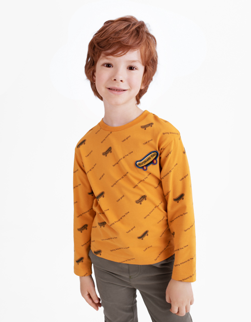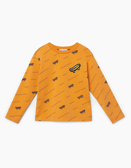 Лонгслив расслабленного силуэта со спущенной линией плеча и круглой широкой горловиной. Выполнен из кулирной глади цвета охра с монохромным текстово-графическим рисунком. Нашивка в виде скейтборда на груди слева.