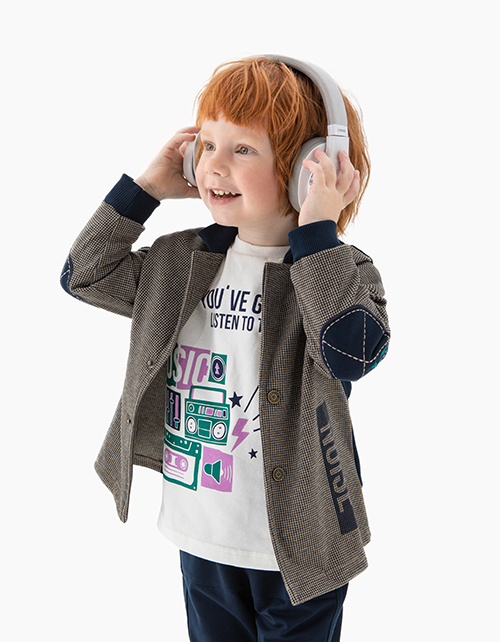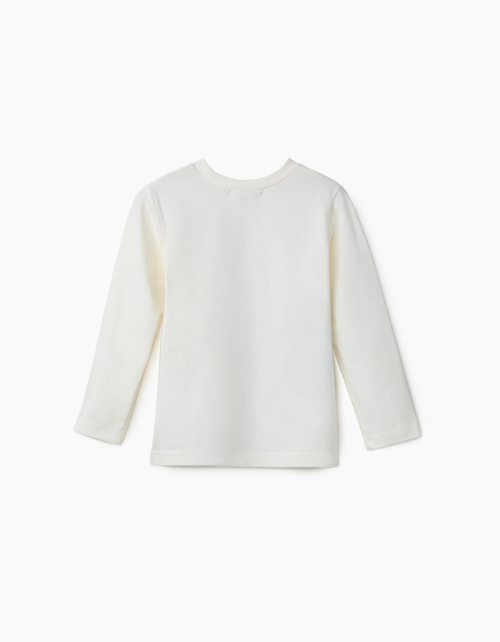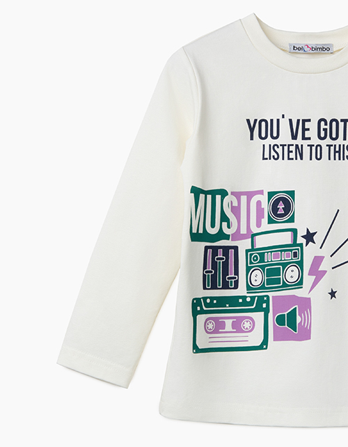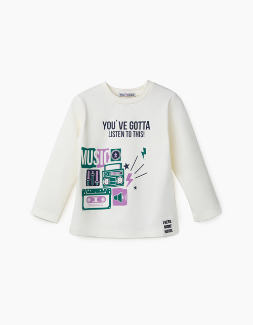 Джемпер прямого силуэта из кулирной глади молочного цвета с начесом. Длинный рукав. Отделка рибаной по горловине. Декорирован принтом YOU`VE GOTTA LISTEN TO THIS ("Вы должны это услышать") и вышивкой на тесьме по низу.