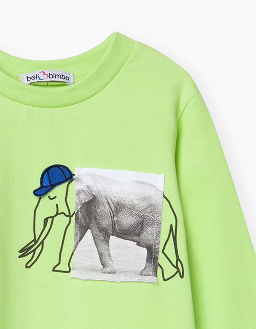 Лонгслив прямого силуэта с круглой горловиной для мальчика. Выполнен из кулирной глади салатового цвета. Спереди декорирован оригинальным коллажем, выполненном в смешанной технике, в виде слона в бейсболке