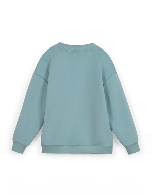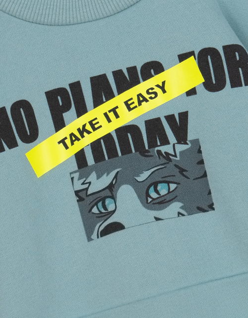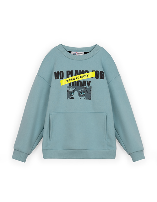 Свитшот в трендовом оттенке лёд для мальчика. Модель прямого силуэта со спущенной линией плеча. Изделие из футера с браш эффектом. Низ, рукава и горловина из рибаны. Свитшот с накладным карманом-кенгуру. Декорирован дизайнерским принтом.
