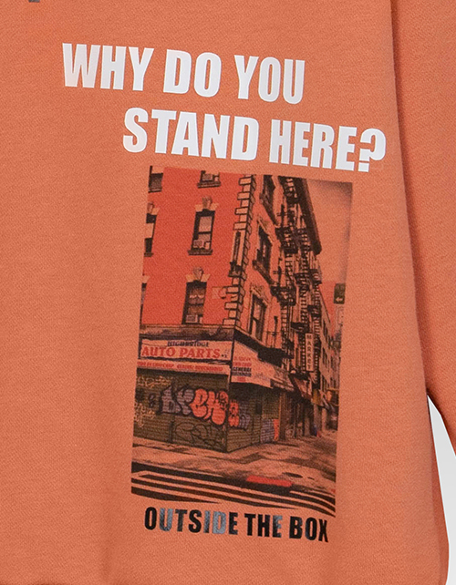 Яркий свитшот тёплого оттенка нектара абрикоса для мальчика. Модель прямого силуэта со спущенной линией плеча. Изделие из мягкого и бархатистого футера. Низ, рукава и горловина из рибаны. Свитшот декорирован стильным дизайнерским принтом.