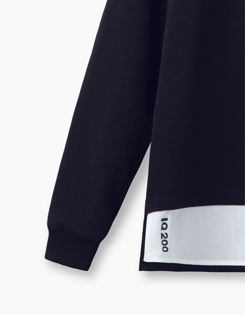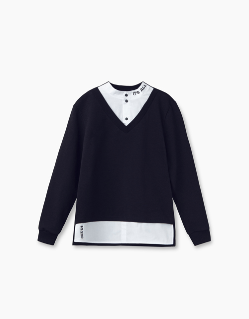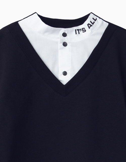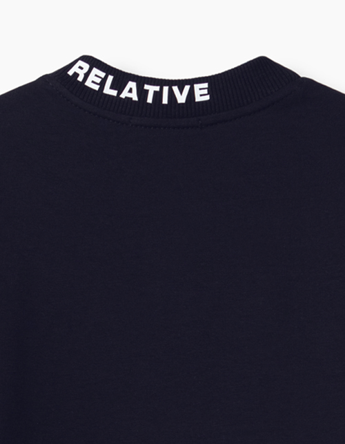 Свободный темно-синий джемпер-обманка. Низ рукава и горловина джемпера - из рибаны. Верх "рубашки" с воротником стойкой и застежкой на книпперы. Фрагмент снизу - с аккуратной небольшой надписью - "Everything's relative".