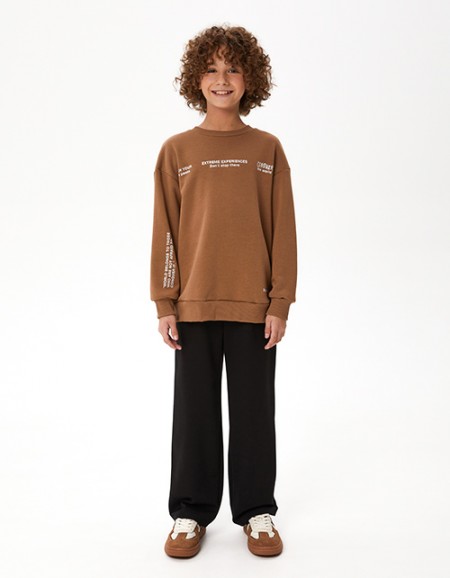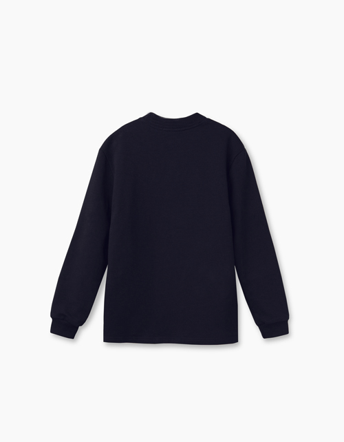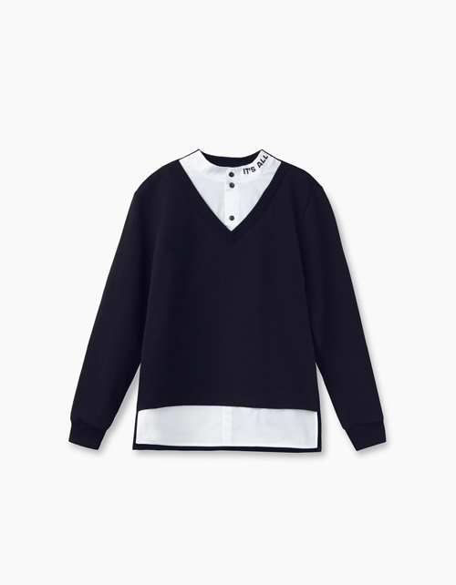 Свободный темно-синий джемпер-обманка. Низ рукава и горловина джемпера - из рибаны. Верх "рубашки" с воротником стойкой и застежкой на книпперы. Фрагмент снизу - с аккуратной небольшой надписью - "Everything's relative".