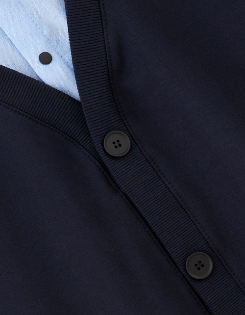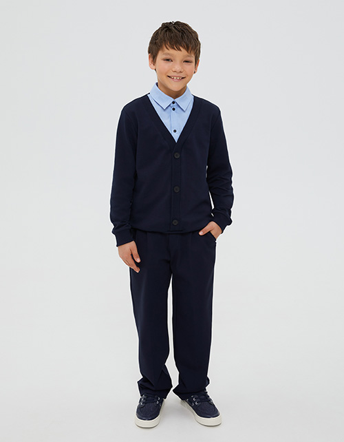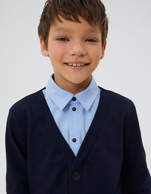 Трендовый джемпер-обманка для мальчика. Модель прямого силуэта. Имитирует комплект из белой рубашки и тёмно-синего кардигана с пришивными пуговицами. Манжеты и низ изделия из рибаны. Удобная застежка на кнопки. Строго соблюдайте рекомендации по уходу!