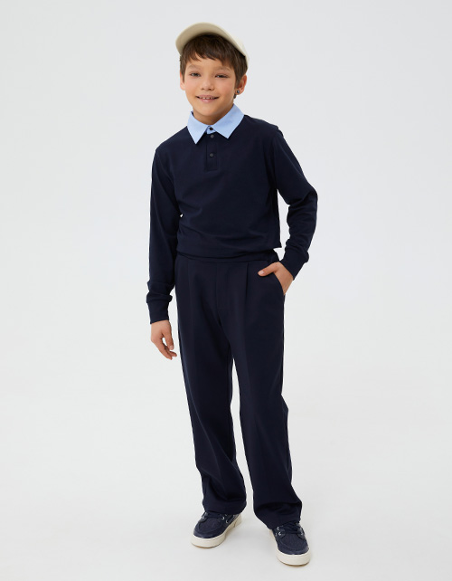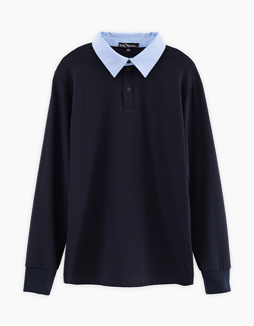 Тёмно-синий лонгслив с рубашечным воротником для мальчика. Модель прямого силуэта. Застёжка поло на кнопки. Контрастный воротник. Строго соблюдайте правила стирки из дополнительной памятки.