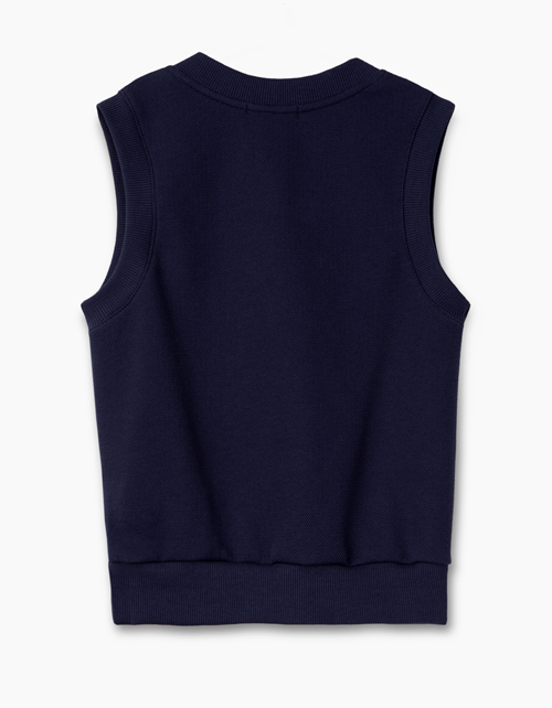 Темно-синий жилет полуприлегающего силуэта. Горловина, пройма и низ изделия оформлены рибаной. Выполнен из трикотажа со особенным переплетением нити - пике. Застегивается на кнопки.