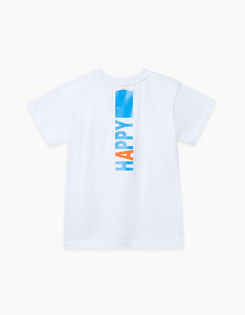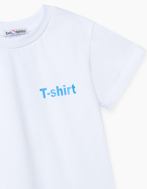 Базовая белая футболка из кулирной глади для мальчика. Прямого силуэта, с круглой горловиной из рибаны в тон. Декорирована ярким текстово-графическим принтом на спине и надписью T-shirt на груди слева.