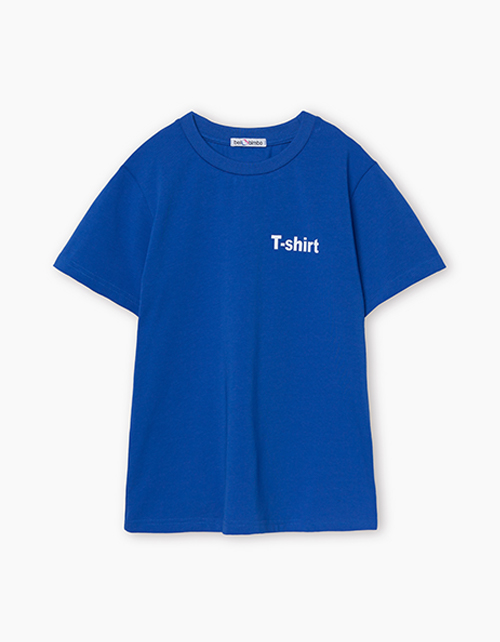 Базовая футболка из кулирной глади синего цвета для мальчика-подростка. Прямого силуэта, с круглой горловиной из рибаны в тон. Декорирована контрастным текстово-графическим принтом на спине и надписью T-shirt на груди слева