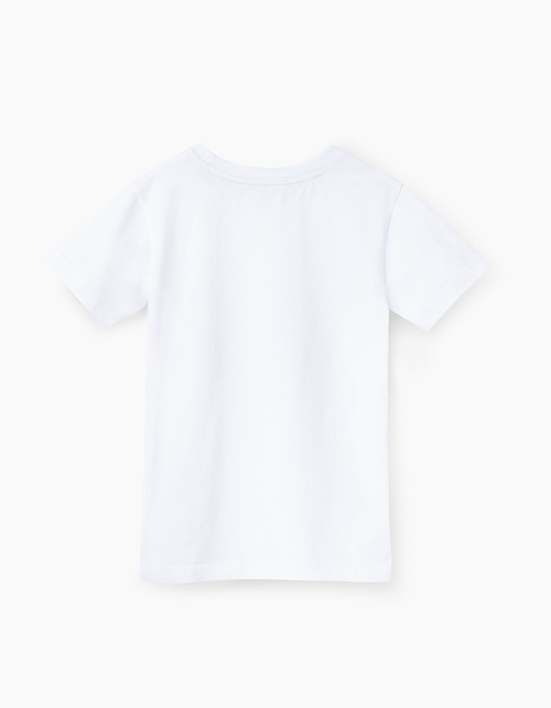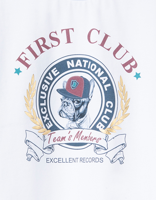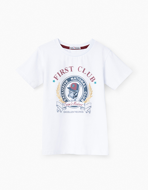Футболка с коротким рукавом для мальчика. Из кулирной глади с эластаном, с отделкой по горловине из рибаны. Декорирован эффектным принтом в стиле символики американского колледжа в основных цветах капсулы.