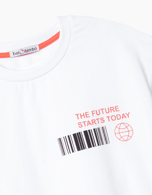 Футболка классического силуэта для мальчика-подростка. Выполнена из белой кулирной глади, с отделкой из рибаны в тон по горловине. Декорирована контрастными текстово-графическими принтами