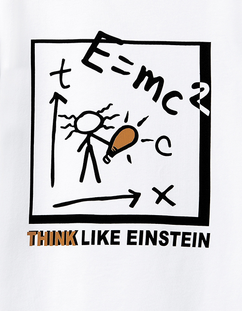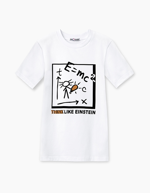Белая футболка с принтом. Горловина с рибаной. Выполнена из белой кулирки, мягкой, прочной и немнущейся ткани. Декорирована "Think like Einstein" ("Думай, как Энштейн").