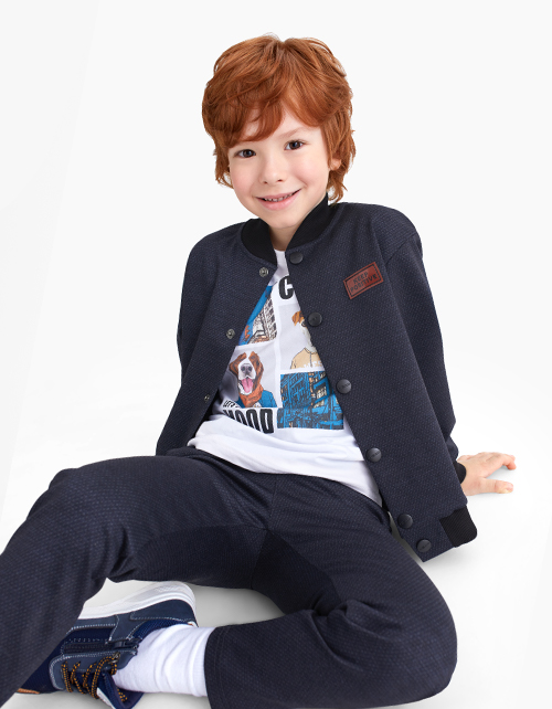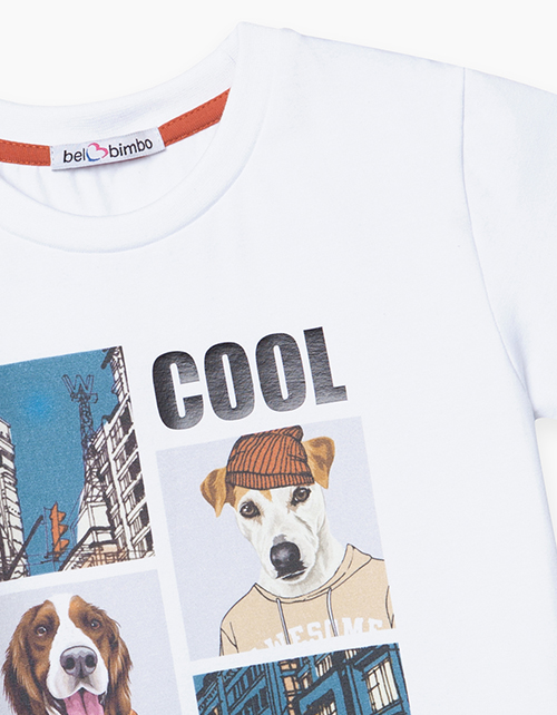 Белая футболка для мальчика. Декорирована ярким принтом в тематике капсулы и контрастными слоганами. Выполнена из кулирной глади с эластаном с окантовкой из рибаны по горловине.