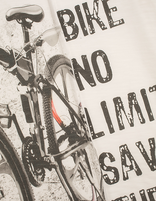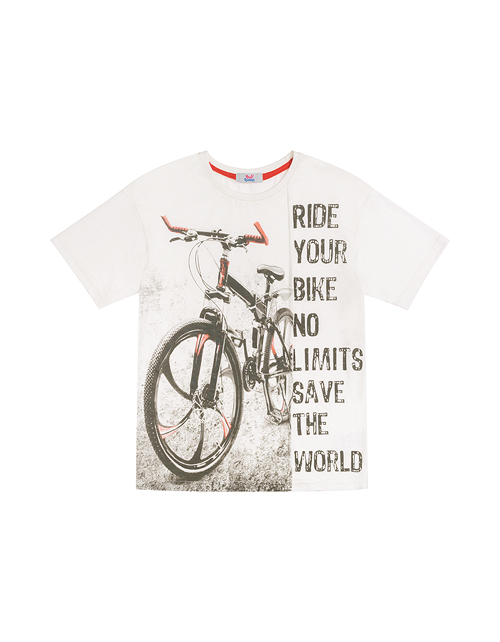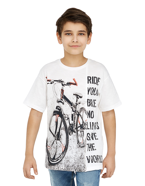 Комфортная футболка в уличном стиле для спортивного парня. Он не любит попусту тратить время и предпочитает свободу, предоставляемую велосипедом. Натуральная ткань, сырые срезы и актуальный принт с яркими акцентами создают стильный непринуждённый образ