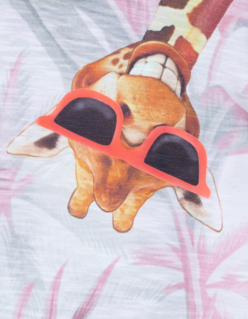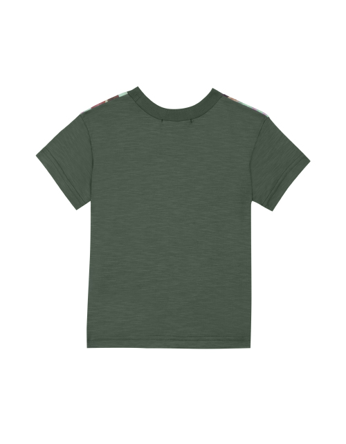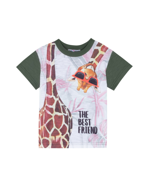 Футболка для мальчика цвета хаки с круглым вырезом горловины. Принт в стилистике тематики "Джунгли трип".