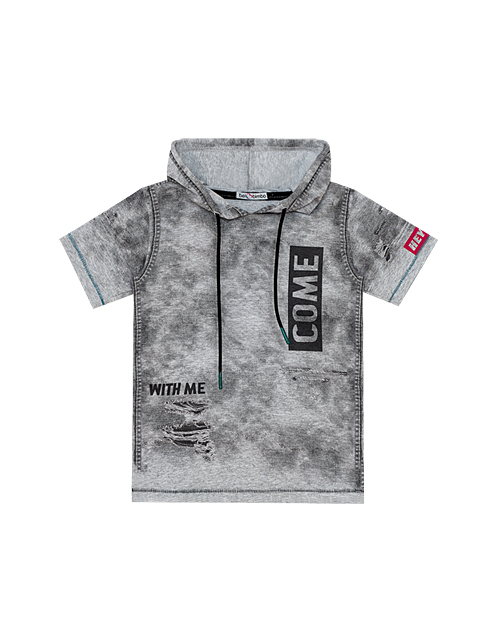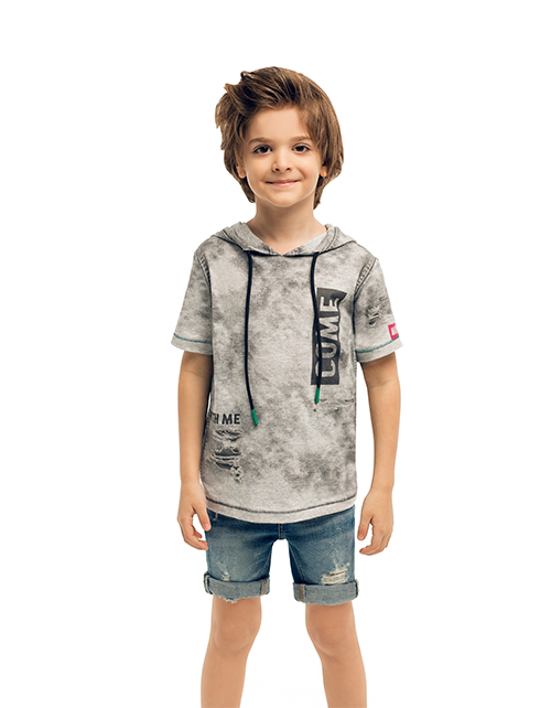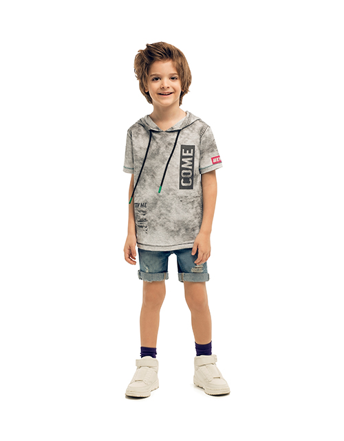 Футболка для мальчика цвета светло-серый меланж с капюшоном. Декоративный шнурок по капюшону. Прямой силуэт, спущенная линия плеча. Дизайнерское оформление в стилистике капсулы "Дружище Бакс".
