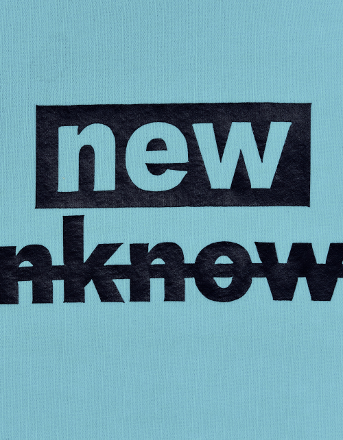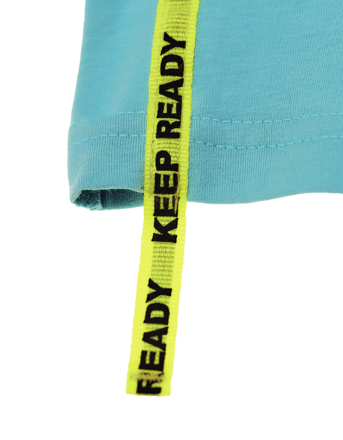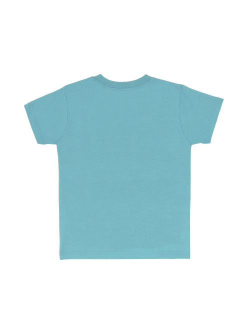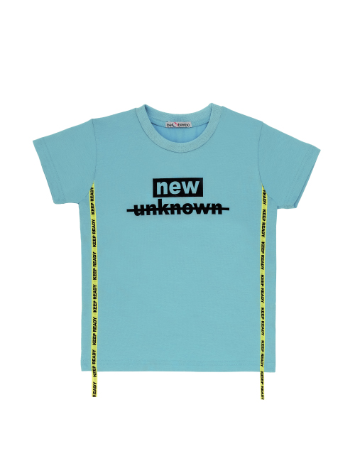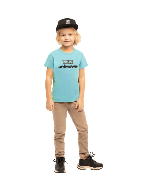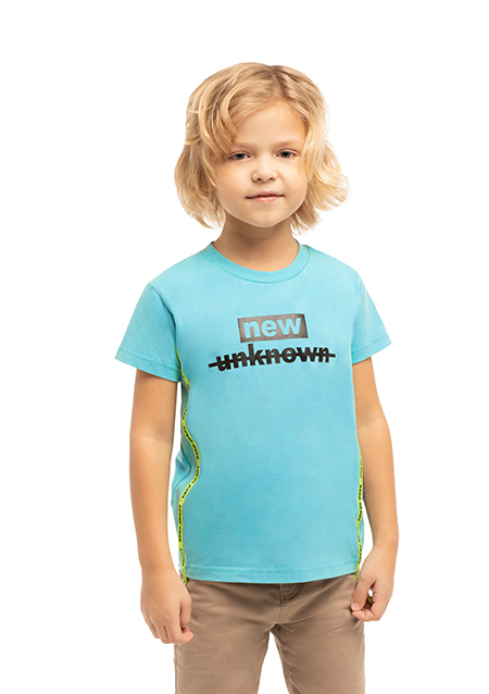 Светло-бирюзовая футболка для мальчика прямого силуэта с круглым вырезом горловины. Декоративная тесьма флуоресцентного лимонного цвета вдоль боковых швов. Принт-надпись в стилистике капсулы "Новый мир".