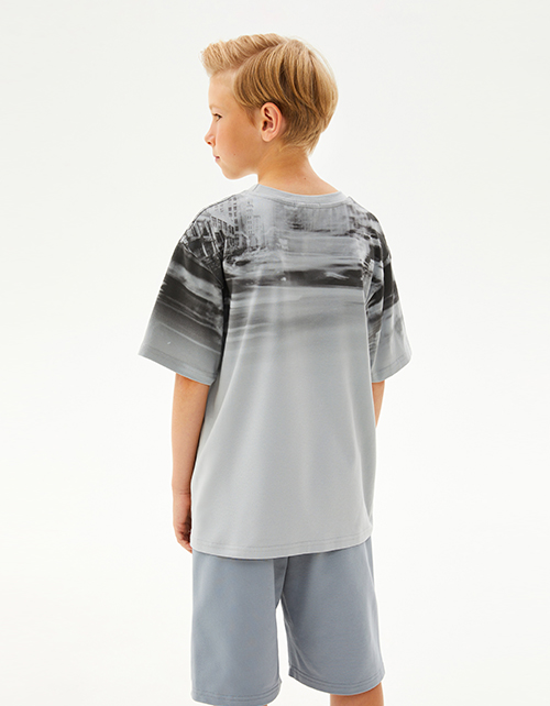 Дизайнерская футболка интересного серо-зелёного оттенка для мальчика. Прямая объёмная модель. Спущенная линия плеча. Эластичная горловина. Футболка с авторским принтом, безопасная и качественная трансферная печать.