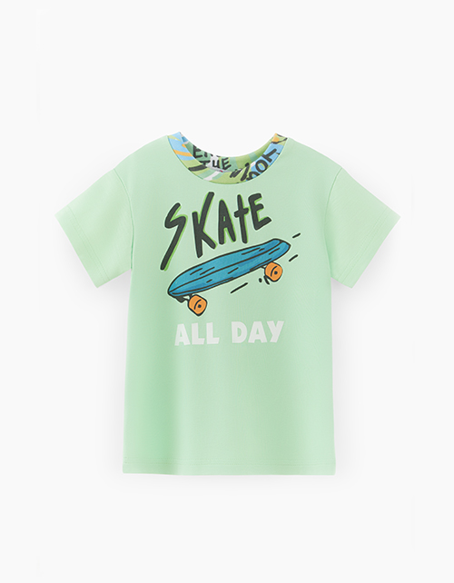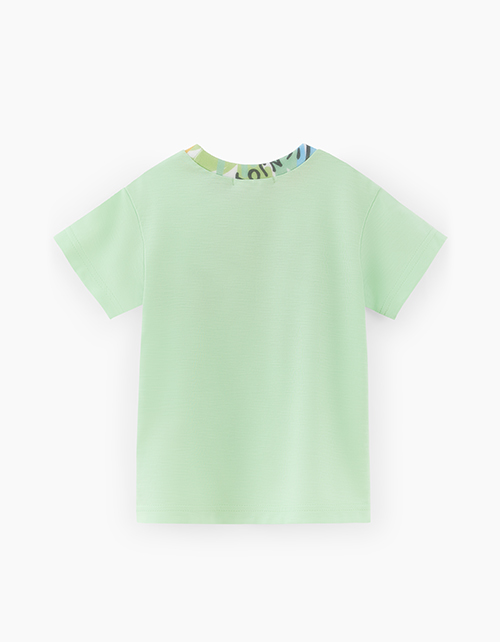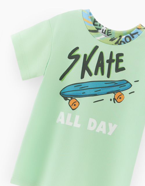 Сочная зелёная футболка для мальчика. Модель прямого силуэта со спущенной линией плеча. Изделие из кулирной глади с авторским принтом.