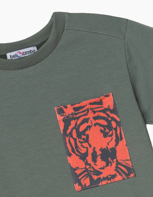 Футболка прямого силуэта для мальчика. Выполнена из кулирной глади цвета хаки. Спереди декорирована нашивкой темно-кораллового цвета с монохромным графическим изображением тигра и контрастной надписью I create my own world ("Я создаю свой мир")