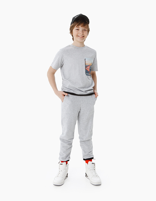 Футболка свободного силуэта с круглой горловиной. Выполнена из серой меланжевой кулирной глади, с отделкой из ткани черного цвета. Декорирована нашивкой с полноцветным фото принтом и надписью The future starts today ("Будущее начинается сегодня")