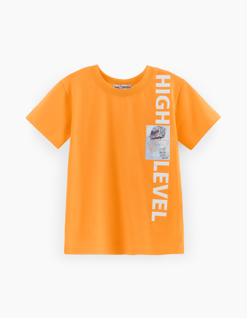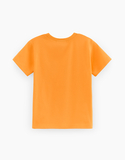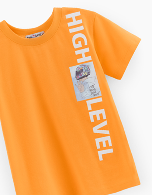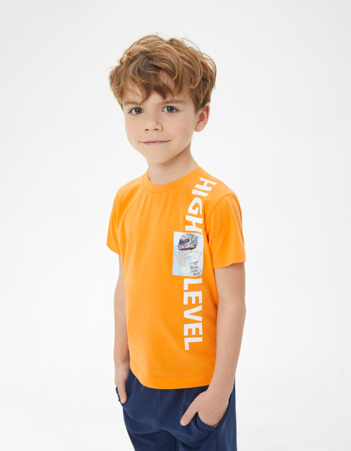 Яркая футболка сочного оттенка маракуйя для мальчика. Модель прямого силуэта со спущенной линией плеча. Изделие из кулирной глади с экосольвентной печатью. Оригинальный нашивной элемент в качестве декора.