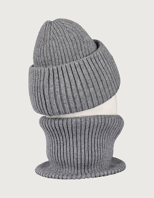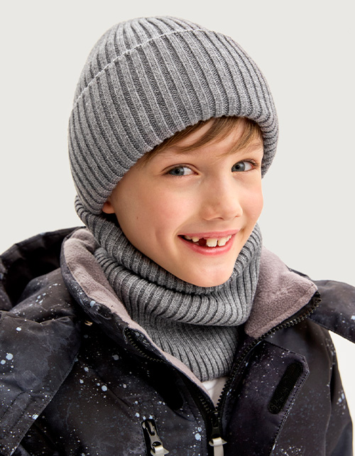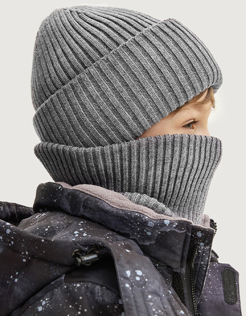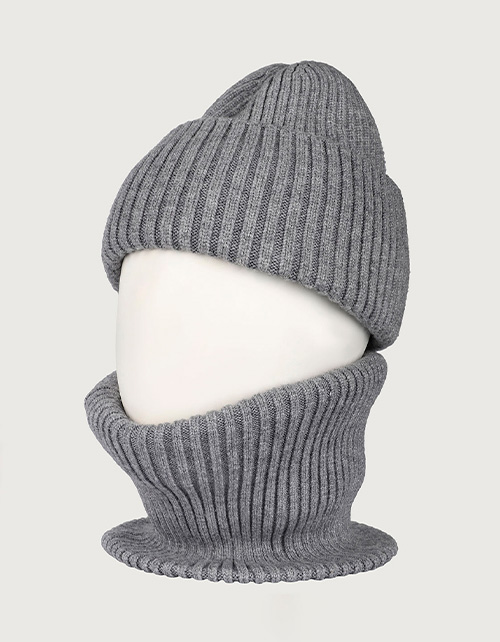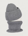 Зимний серый комплект для мальчика: шапка с флисовой подкладкой и двойной снуд. Лёгко надевается, надёжно защищает от холода до -25°C. Практичное и стильное решение для зимних прогулок.