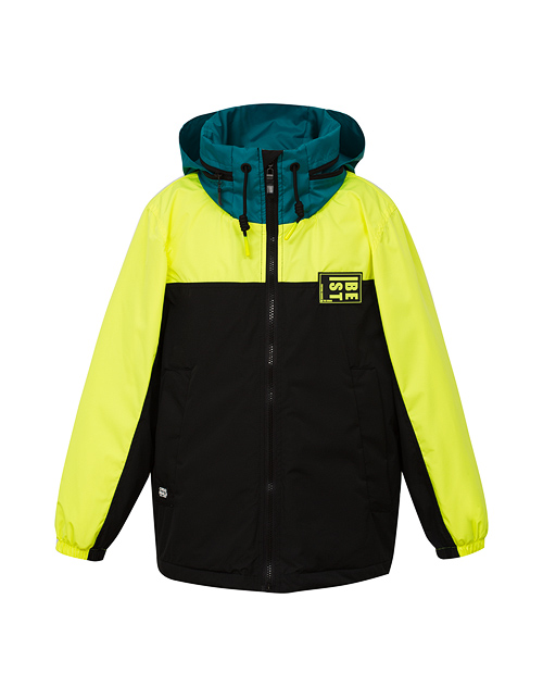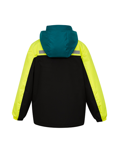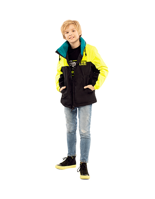 Комбинированная куртка для мальчика. Прямой силуэт. Центральная застежка на молнию, регулировка по низу изделия на шнурке. Манжеты на эластичной резинке. Карманы-листочки и резиновая нашивка.