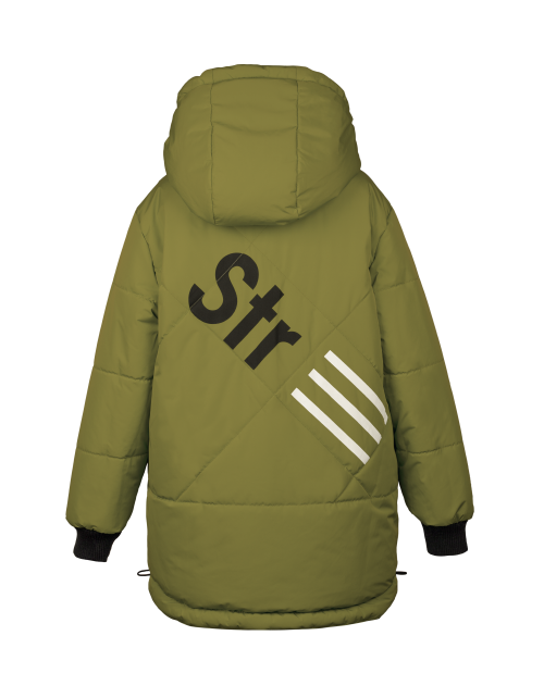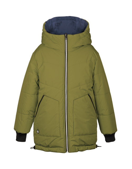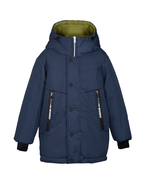 Теплая куртка для мальчика на синтепоне имеет прямой силуэт, дополнена капюшоном, застежкой на молнии, контрастными манжетами и стильным принтом на спине. Двусторонняя куртка пошита из ткани добби, а изнутри выполнена из матовой плащевой дьюспо.