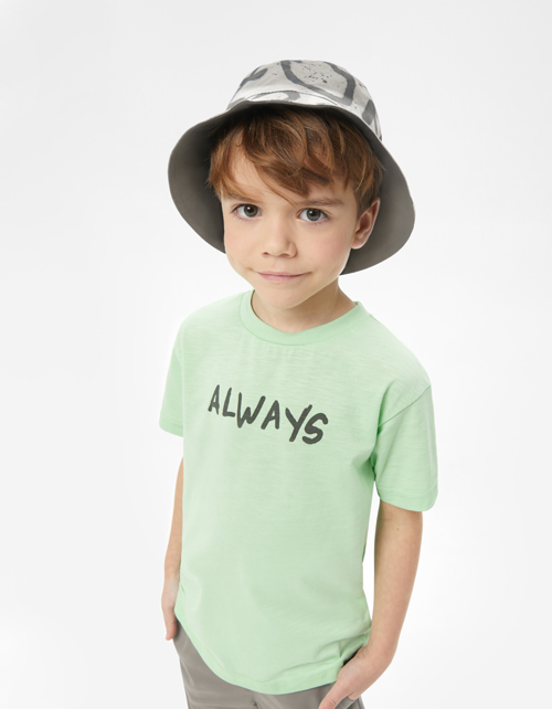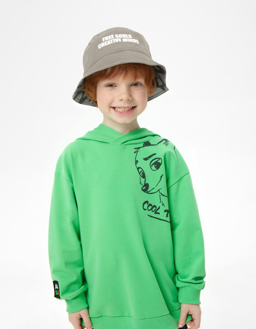 Двусторонняя панама для мальчика. Стороны: серая и набивная. Модель с полями, из твила. Изделие декорировано цифровым принтом и трансферной плёнкой.