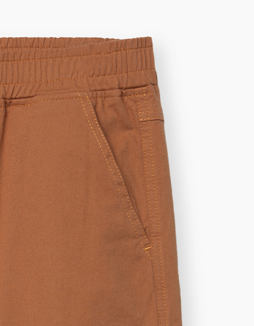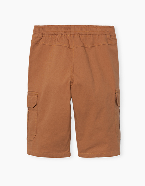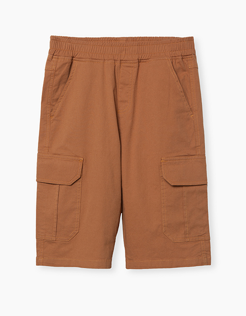 Шорты свободного силуэта в стиле карго для подростка. Из твила песочного цвета. Эластичный пояс обеспечивает комфортную посадку по талии. Вместительные карманы делают модель функциональной. Имитация гульфика, кокетка сзади добавляют стильные акценты