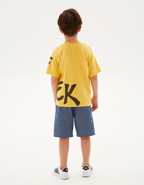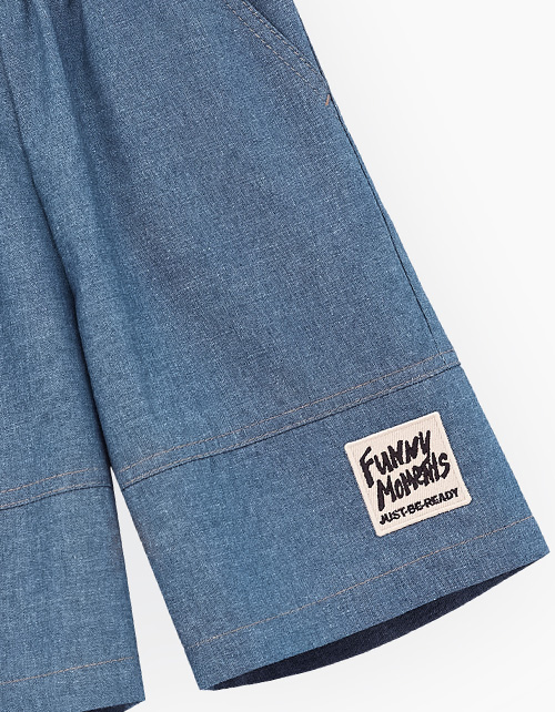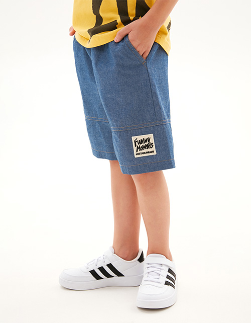 Шорты из облегчённого джинса для мальчика. Модель прямого силуэта. Изделие на мягком поясе, со средней посадкой. Шорты дополнены карманами-хулиганами. Декорированы контрастными отстрочками и нашивкой.