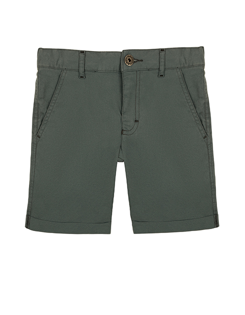 Шорты для мальчика цвета хаки. Передние и задние накладные карманы. Отвороты по низу изделия. Шлёвки по поясу.