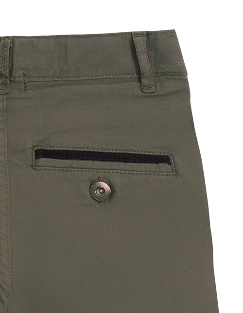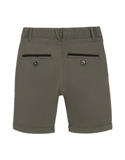Оливковые шорты для мальчика. Передние и задние накладные карманы. Отвороты по низу изделия. Шлёвки по поясу.