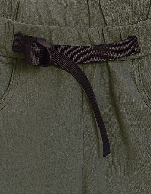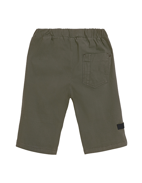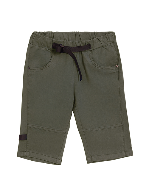 Оливковые шорты для мальчика на резинке. Функциональная нашивка на пояс с возможностью регулировки талии. Передние и накладной задний карман.