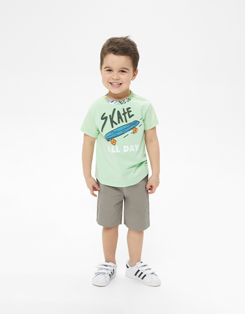 Серо-коричневые шорты для мальчика. Модель прямого силуэта со средней посадкой. Шорты из комбинированного материала: футер и твил. Максимально комфортное изделие без застёжек, на мягком поясе. Модель декорирована вышивкой с аппликацией.