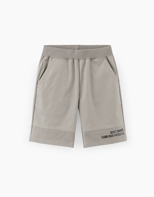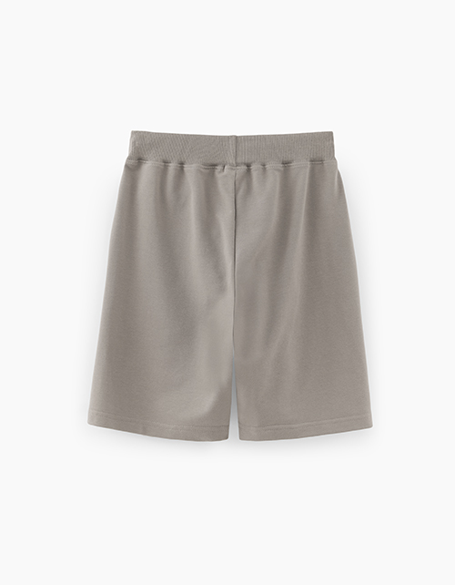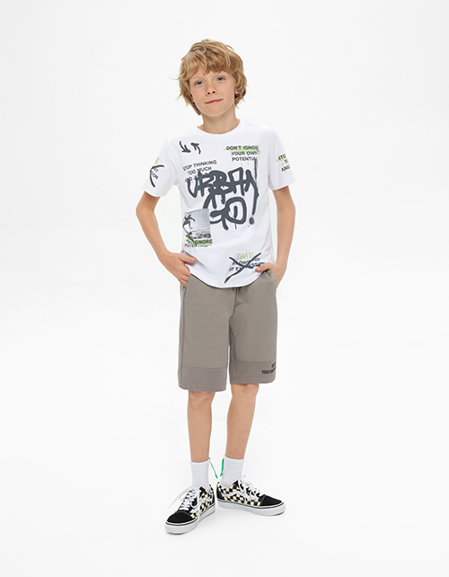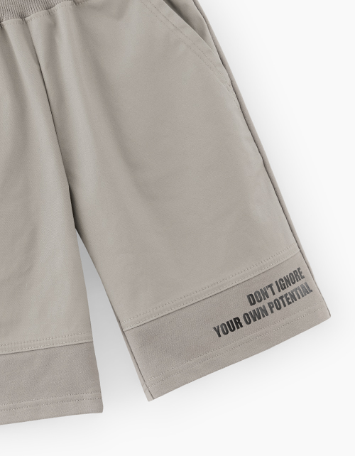 Серо-коричневые шорты для мальчика. Модель прямого силуэта со средней посадкой. Максимально комфортное изделие без застёжки, на мягком поясе. Шорты из комбинации материалов: твил и футер, что добавляет изделию удобства.