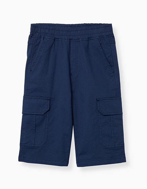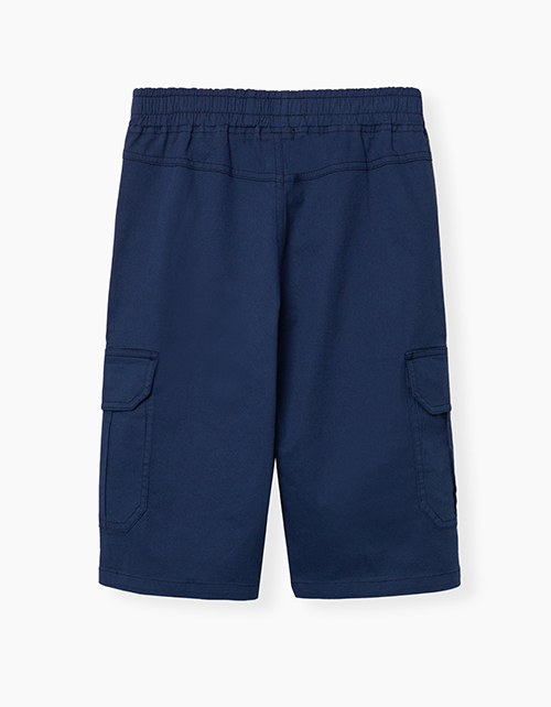 Шорты свободного силуэта в стиле карго для подростка. Из твила синего цвета. Эластичный пояс обеспечивает комфортную посадку по талии. Вместительные карманы делают модель функциональной. Имитация гульфика и кокетка сзади добавляют стильные акценты
