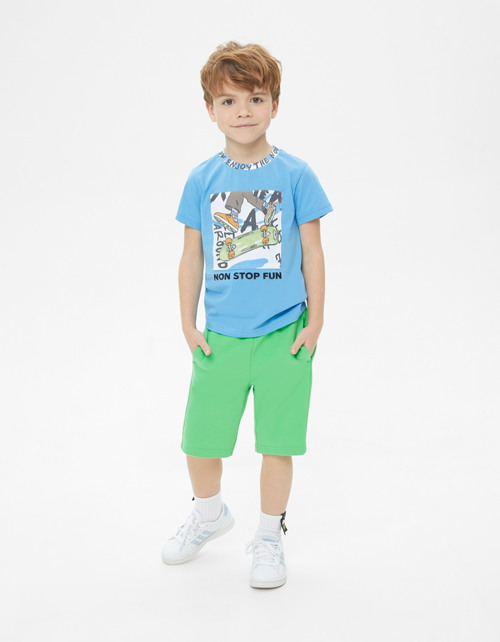 Яркие летне-зелёные шорты для мальчика. Удобная модель прямого силуэта со средней посадкой. Изделие из футера с браш-эффектом на мягком поясе декорировано вышивкой.