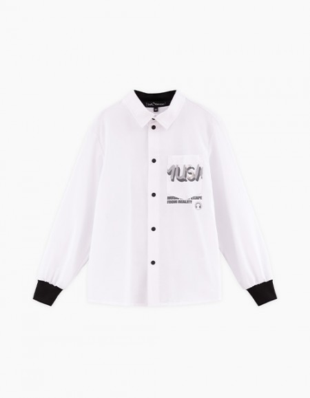 Лаконичная белая рубашка прямого силуэта с коротким рукавом для мальчика. Спущенная линия плеча. Комфортная застёжка на контрастные кнопки. Комбинация материалов: кулирная гладь и сорочечная ткань.