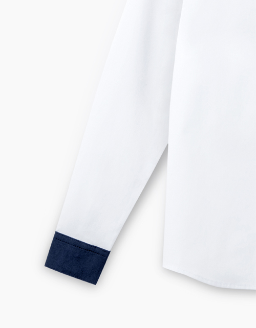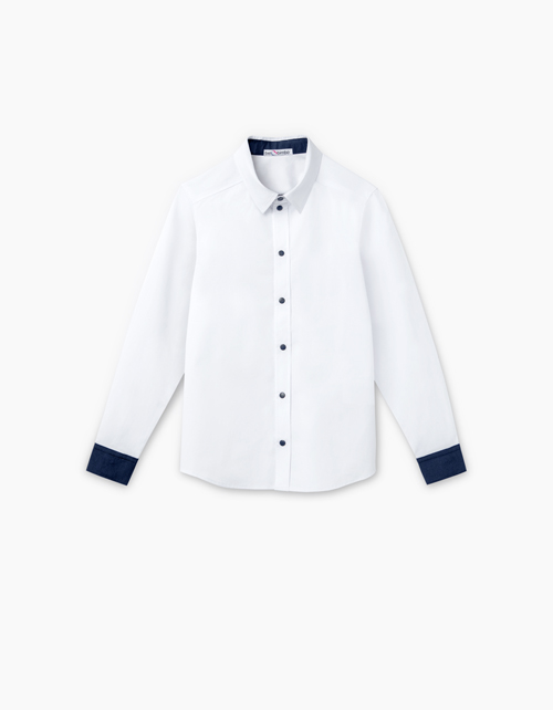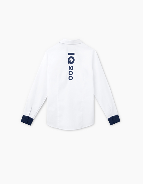 Приталенная школьная рубашка. Воротник стойка и манжеты из ткани синего цвета. Застегивается на кнопки. На спине лаконичный принт "IQ200".