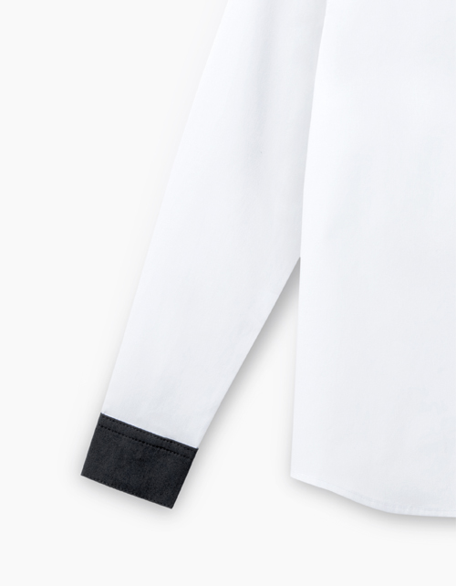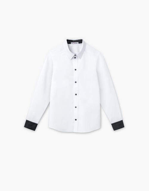 Приталенная школьная рубашка. Воротник стойка и манжеты из ткани черного цвета. Застегивается на кнопки. На спине лаконичный принт "IQ200".
