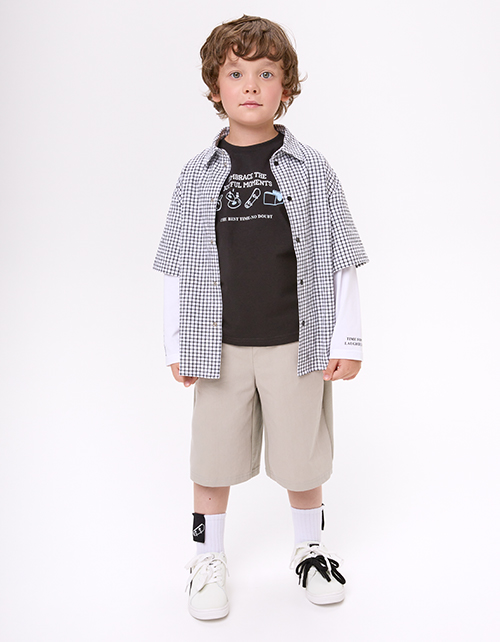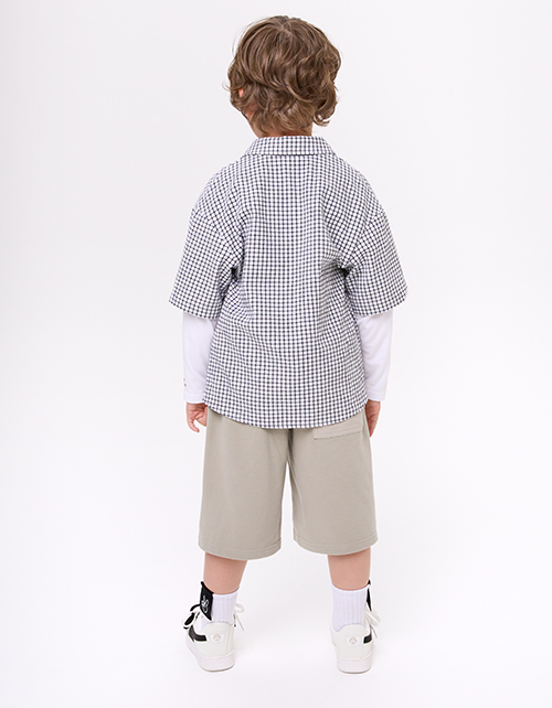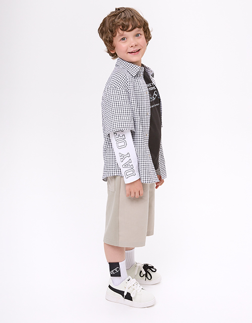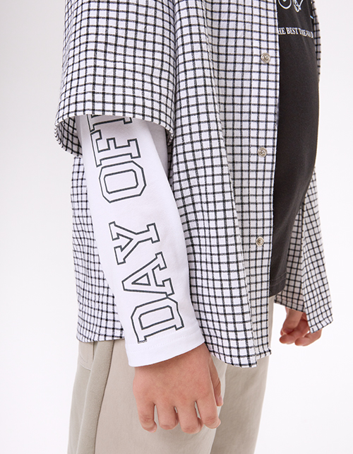 Модель в клетку с прямым кроем выполнена в стиле имитации лонга и рубашки. Длинный рукав из кулирки и короткий из основной ткани создают многослойный эффект. Жатая сорочечная ткань и принт с термотрансфером подчёркивают современный, расслабленный стиль.
