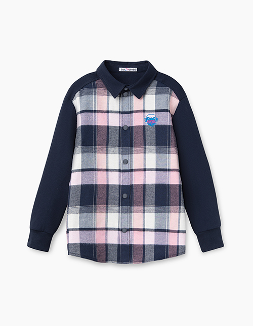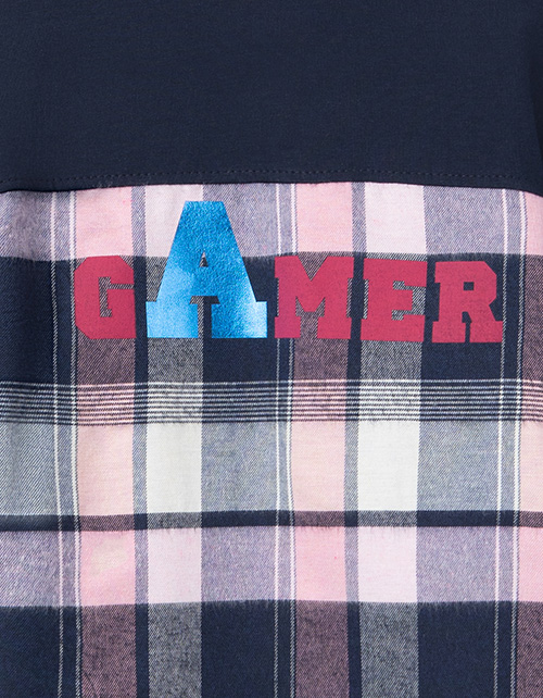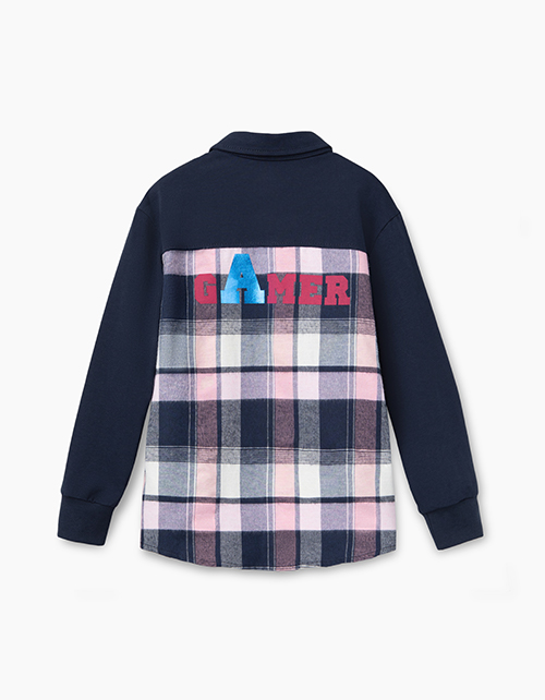 Рубашка с длинным рукавом для мальчика. Из комбинации сорочечной фланели в клетку и кулирной глади с начесом. Манжеты из рибаны. Модель декорирована маленькой вышивкой спереди и принтом GAMER ("Геймер") на спине