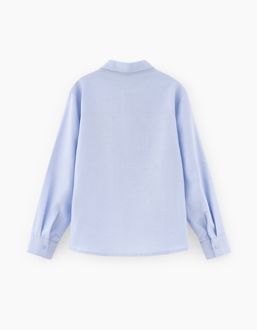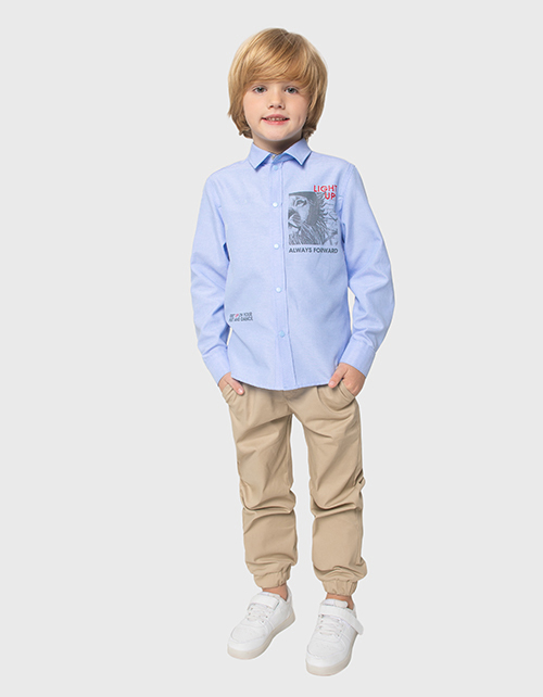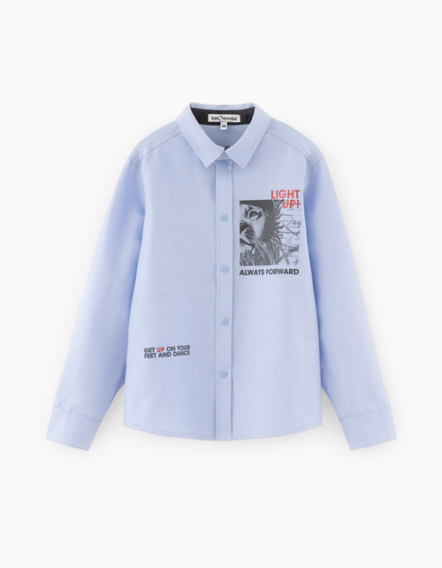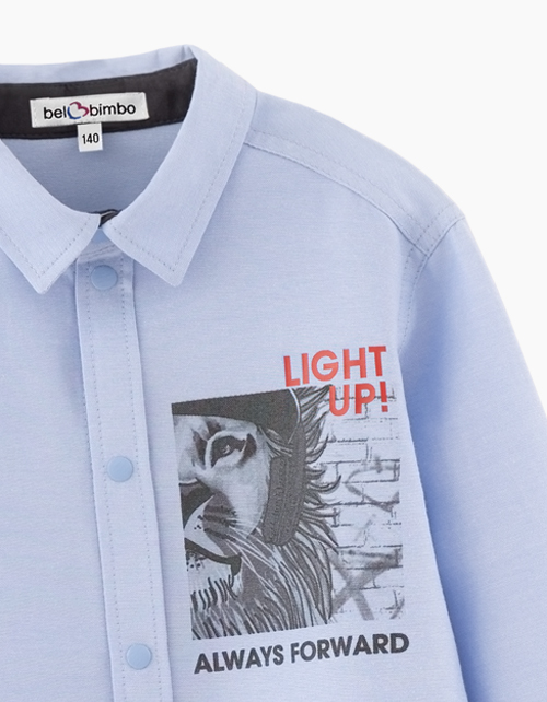 Стильная светло-голубая рубашка для мальчика. Комфортная модель с застежкой на кнопки декорирована тематической цифровой печатью.