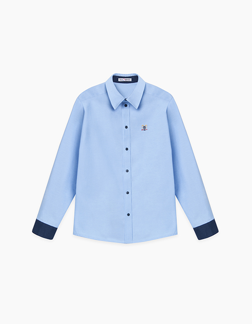Светло-голубая рубашка классического прямого силуэта. Модель с длинным рукавом. Темно-синие манжеты, застежки-книпперы и отделка на внутренней стороне воротника. Рубашка декорирована фирменной эмблемой и контрастным текстовым принтом
