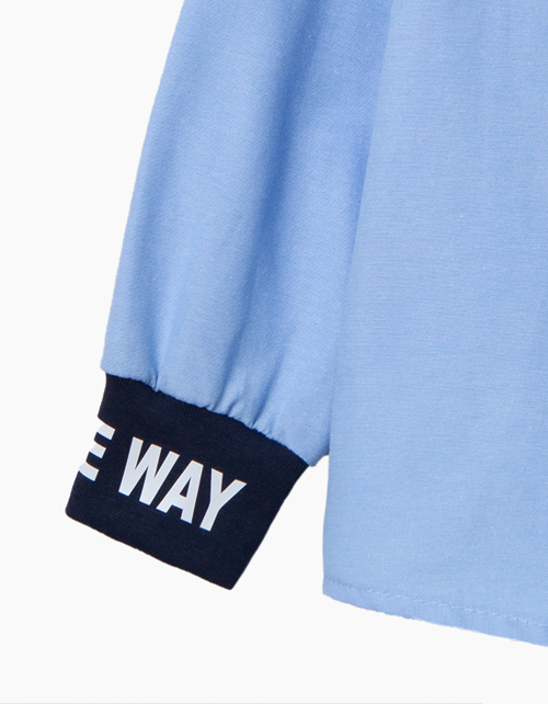 Светло-голубая сорочка свободного силуэта. Выполнена из сорочечной ткани, с эластичными манжетами из рибаны. Застежка на книпперы черного цвета. Декорирована контрастными текстово-графическими принтами в тематике капсулы на манжетах и на спинке