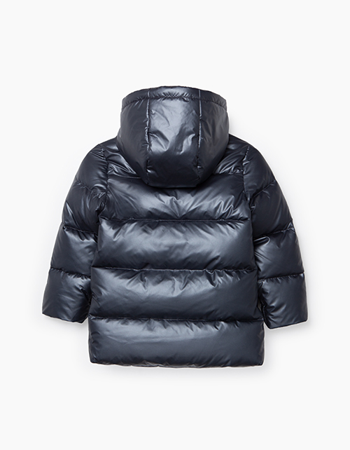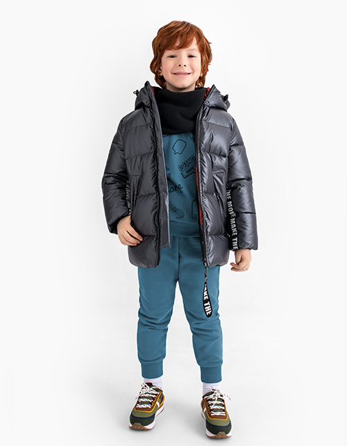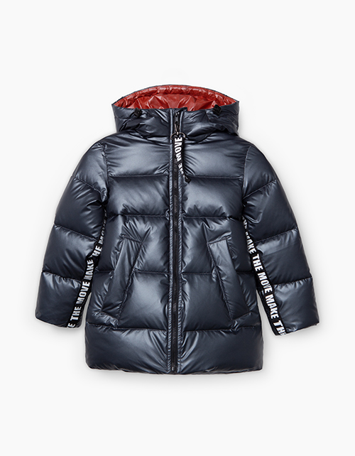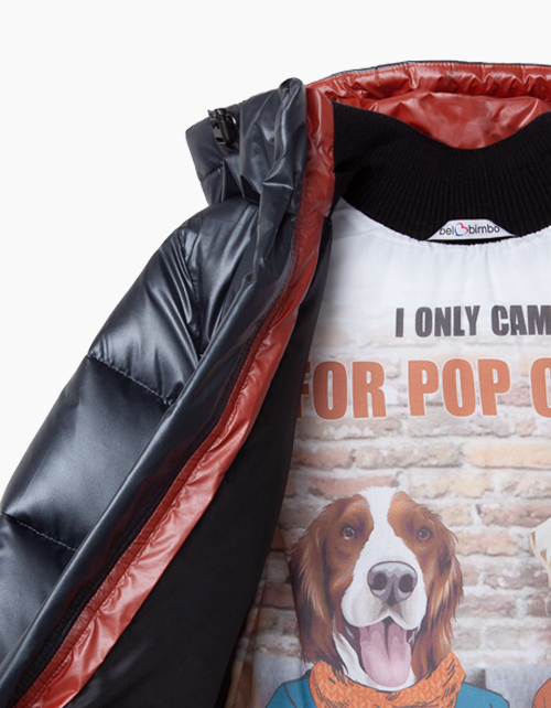 Стильная черная куртка прямого силуэта. Утеплитель синтепух. Модель с подкладкой из хлопка и нейлона с изображением героев из капсулы. Дополнена притачным капюшоном на эластичном шнуре и прорезными карманами.