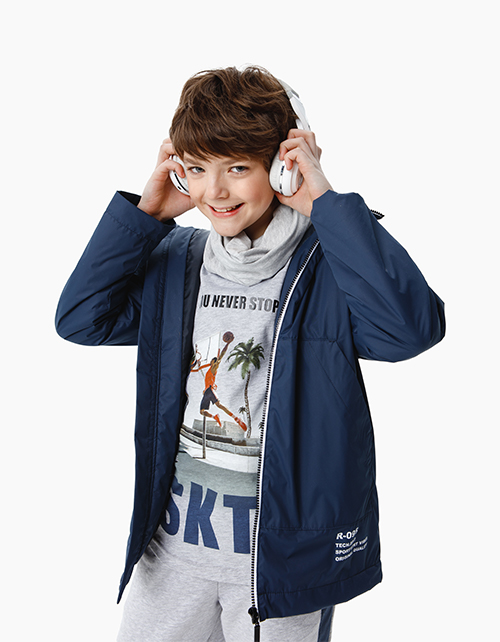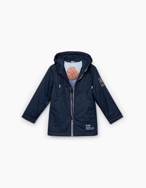 Утепленная куртка из темно-синей плащевой ткани с капюшоном . Подкладка декорирована фотопринтом в тематике стритбола. Образ дополняют стильные акценты: карман-кенгуру, контрастные надписи и отделка молнии, нашивка на рукаве и тесьма на спинке